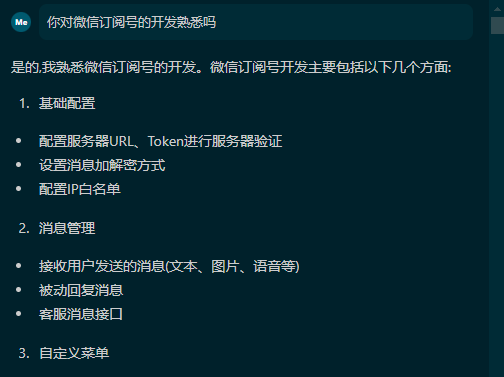 和AI讨论的第一步,当然是让它进入角色,所以我问它:你是不是熟悉微信订阅号的开发?它的回答是令人安心的。