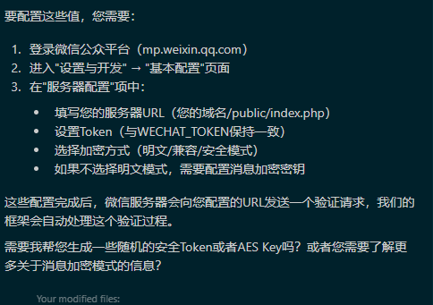 后续的工作也一样简单:基本的框架文件是AI生成的,需要填写的一些敏感信息AI当然无法获得,但它很正确地告诉我从哪里去获得这些内容: